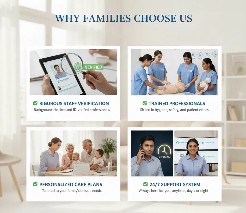 ✅ Rigorous Staff Verification Your safety is our top priority. Every caregiver, nanny, and bystander undergoes a thorough background check and identity verification process before they ever step foot in your home.
